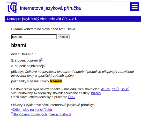 Příklad použití: Budu-li si chtít ověřit, zda existuje slovo „bizardní“, jednoduše tento tvar zadám do vyhledávání ve slovníkové části. Výsledkem hledání pak bude jeho správný tvar – „bizarní“.