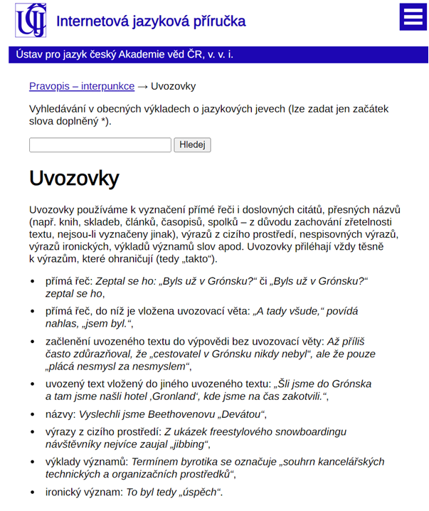 Příklad použití: Pokud si nebudu jistá psaním uvozovek u přímé řeči, postačí do vyhledávání u výkladové části zadat heslo „uvozovky“, pod kterým najdu ucelený výklad o jejich správném použití včetně příkladů.
