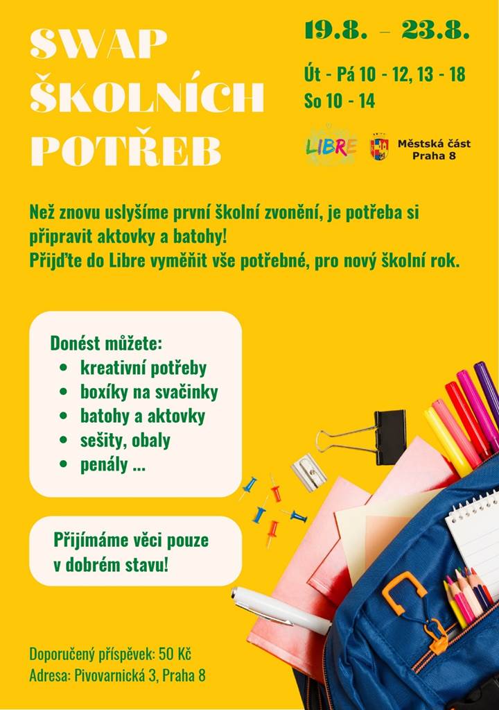 Na Praze 8 probíhá 19. 8. do 23. 8. „swap školních potřeb“, kam může každý přinést věci, pro které již nemá využití. Každý si zároveň může odnest to, co potřebuje. Více informací zde.