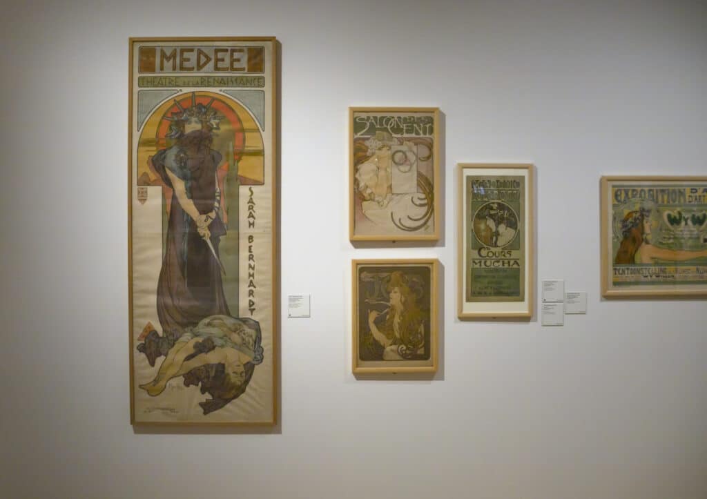 Dalším slavným umělcem, jehož plakáty jsou na výstavě k vidění, je ikonický secesní malíř Alfons Mucha. Málokdo ví, že to byly právě plakáty, které mu pomohly Muchovi prorazit. Psal se rok 1894, když slavná francouzská herečka Sarah Bernhardt uviděla finální podobu plakátu k nové hře s názvem Gismonda, kde měla ztvárnit hlavní roli. Volala řediteli Lemercierovy litografické dílny, kde vznikl původní plakát, a chtěla okamžitě zcela odlišnou verzi. Vzhledem k tomu, že byly Vánoce, neměl ředitel po ruce žádného se svých předních výtvarníků. Jediný, kdo v této chvíli v dílně tvořil, byl mladý student umění, Alfons Mucha.
